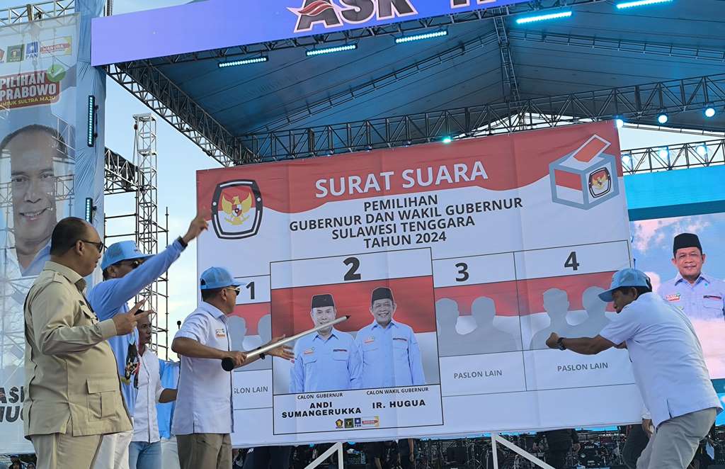Sebelum menutup orasinya, ASR-Hugua melakukan simulasi pemilihan. Dalam simulasi tersebut, ASR-Hugua mencoblos no dua, ASR-Hugua sebagai Gubernur dan Wakil Gubernur Sultra yang disaksikan seluruh peserta Kampanye Akbar. (Red)