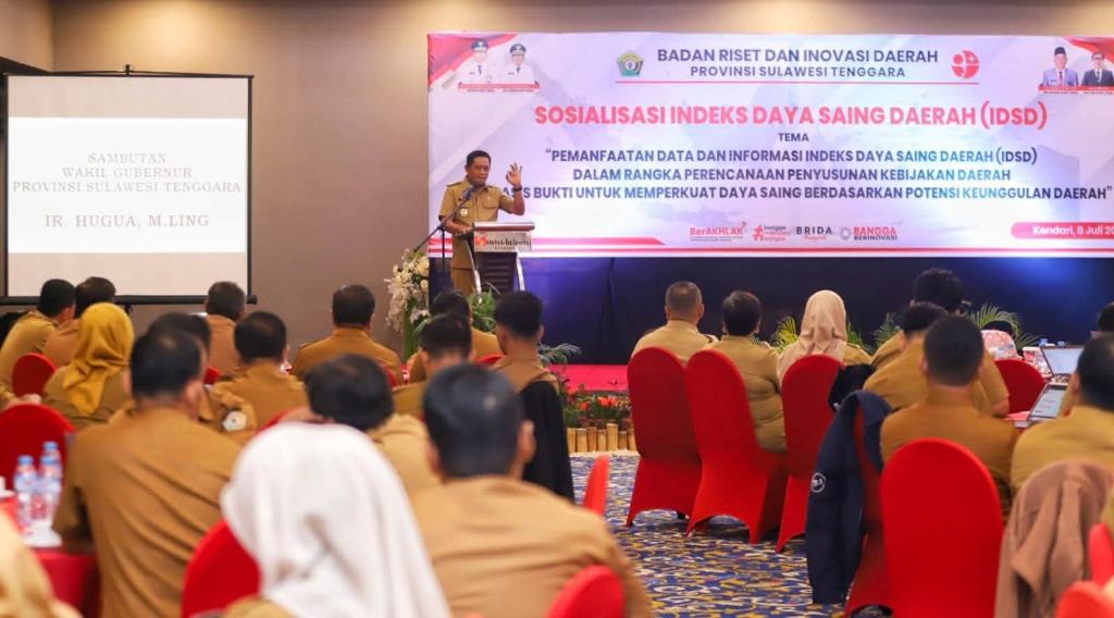 Swarasultra.id, Kendari – Wakil Gubernur (Wagub) Sulawesi Tenggara (Sultra) Ir. Hugua, M.Ling menegaskan pentingnya peran pemerintah provinsi dalam memperkuat daya saing daerah. Hal ini disampaikan Wagub Sultra saat membuka kegiatan Sosialisasi Indeks Daya Saing Daerah (IDSD) yang diselenggarakan oleh Badan Riset dan Inovasi Daerah (Brida) Provinsi Sultra pada Selasa (8/7/2025) di Swiss-Belhotel Kendari.