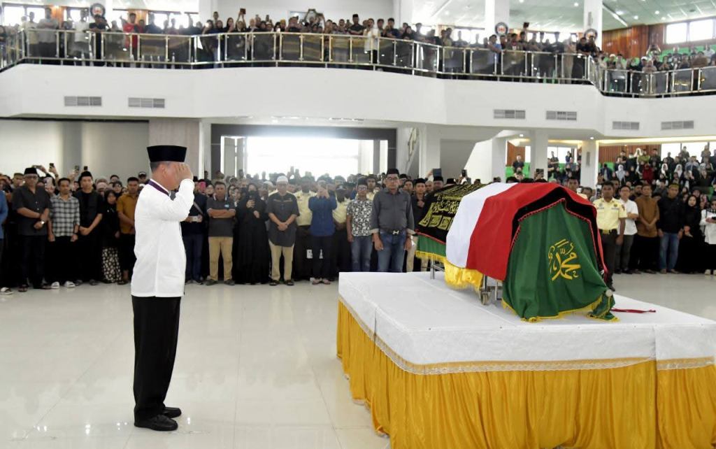 Swarasultra.id, Kendari – Prosesi upacara persemayaman jenazah Rektor Universitas Haluoleo (UHO) Kendari, Prof. Armid, S.Si., M.Si., M.Sc., D.Sc., berlangsung khidmat di gedung Auditorium UHO pada Minggu (24/8/2025).