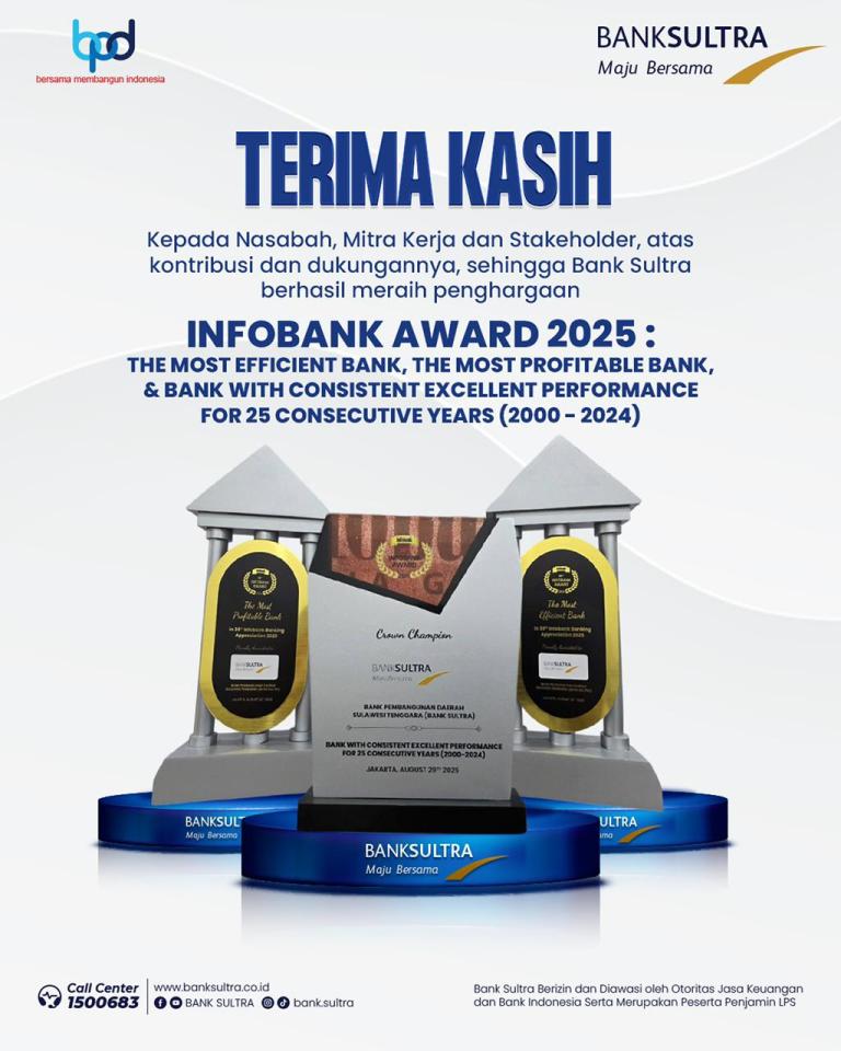“Prestasi ini tidak lepas dari kerja keras seluruh insan Bank Sultra serta dukungan para nasabah dan pemangku kepentingan. Ke depan, kami akan terus memperkuat peran Bank Sultra sebagai bank daerah yang sehat, adaptif, dan kompetitif di tengah tantangan perubahan ekonomi global,” tegasnya.