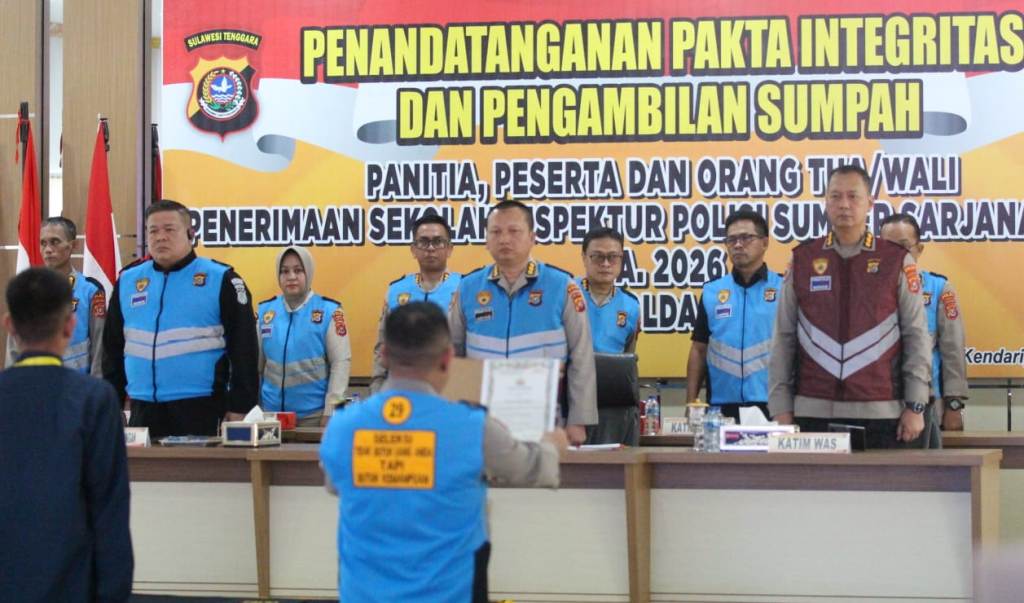 Swarasultra.id, Kendari – Kepolisian Daerah Sulawesi Tenggara menggelar kegiatan Penandatanganan Pakta Integritas dan Pengambilan Sumpah Panitia, Peserta, serta Orang Tua/Wali Seleksi Penerimaan Sekolah Inspektur Polisi Sumber Sarjana (SIPSS) Tahun Anggaran 2026, yang berlangsung di Aula Dachara Polda Sultra, Kamis (22/1/2026).