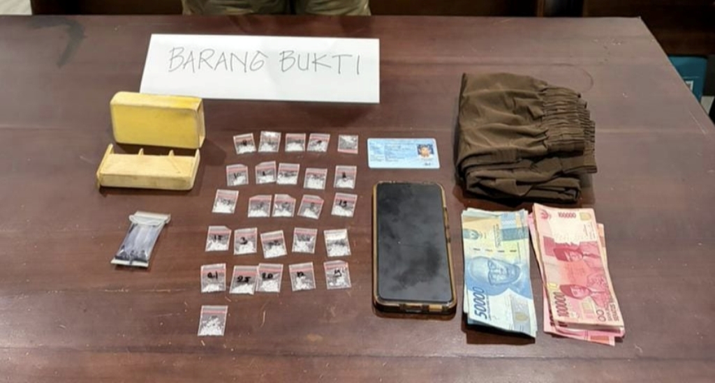 Dari hasil penggeledahan, polisi menemukan 26 sachet plastik klip berisi kristal bening yang diduga narkotika jenis sabu, disembunyikan dalam sebuah kotak kecil berwarna kuning di area dapur rumah terduga. Selain narkotika, turut diamankan barang bukti lain berupa satu unit telepon genggam, uang tunai sebesar Rp650.000, serta sejumlah barang pribadi lainnya.