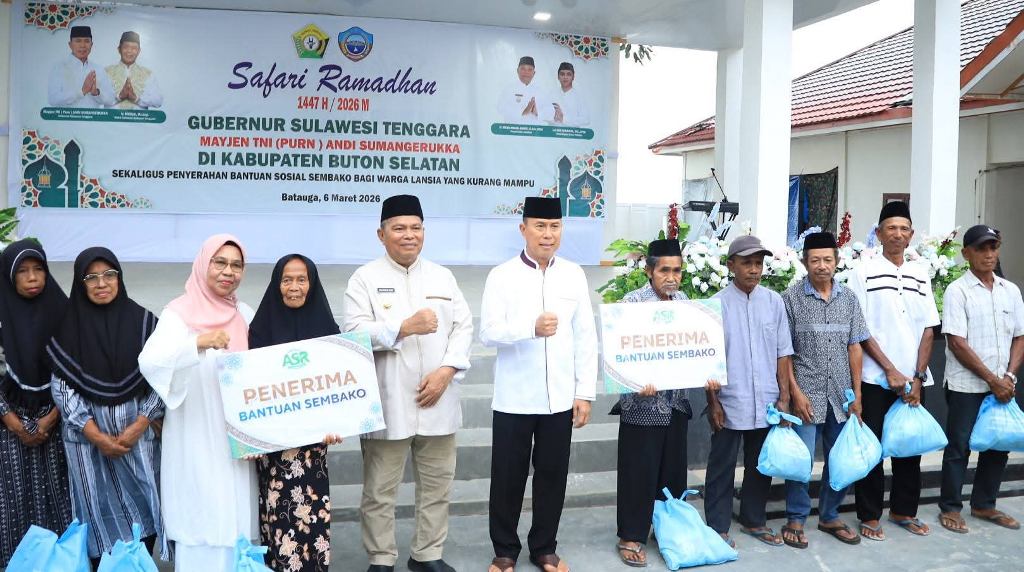 Swarasultra.id, Buton Selatan – Gubernur Sulawesi Tenggara (Sultra), Mayjen TNI (Purn) Andi Sumangerukka, menyerahkan bantuan kepada masyarakat saat melaksanakan Safari Ramadan di Kabupaten Buton Selatan. Kegiatan tersebut dirangkaikan dengan buka puasa bersama warga dan jajaran Pemerintah Kabupaten Buton Selatan di Rumah Jabatan Bupati pada Jumat (6/3/2026).