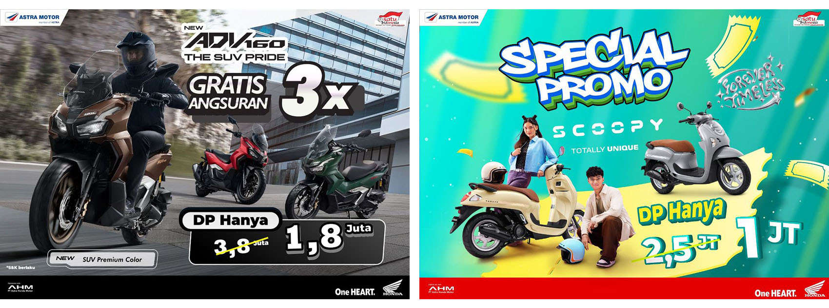 Salah satu penawaran yang dihadirkan adalah Special Promo untuk Honda Scoopy, di mana konsumen bisa membawa pulang motor bergaya stylish tersebut dengan uang muka (DP) mulai dari Rp1 juta.
