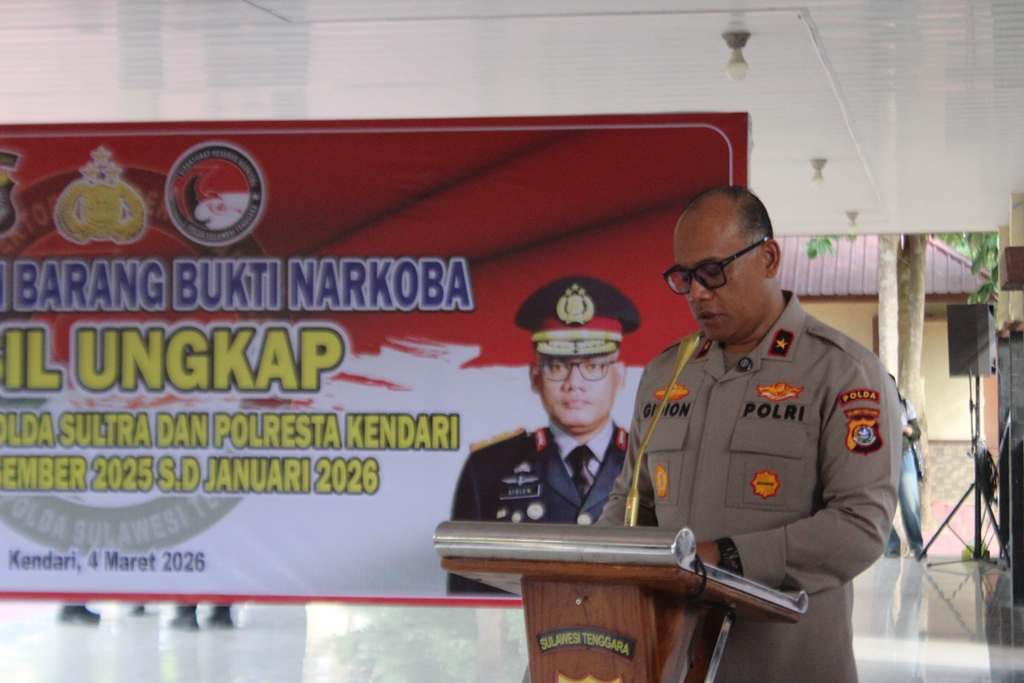 Swarasultra.id, Kendari – Kepolisian Daerah Polda (Polda) Sulawesi Tenggara (Sultra) memusnahkan barang bukti narkotika skala besar di Mapolda Sultra, Rabu (4/3/2026), sebagai bentuk nyata perang terhadap peredaran gelap narkoba di Bumi Anoa. Pemusnahan yang dipimpin langsung oleh Wakapolda Sultra, Brigjen Pol. Gidion Arief Setyawan ini, menandai komitmen kepolisian dalam mengawali langkah tegas di awal Maret 2026.