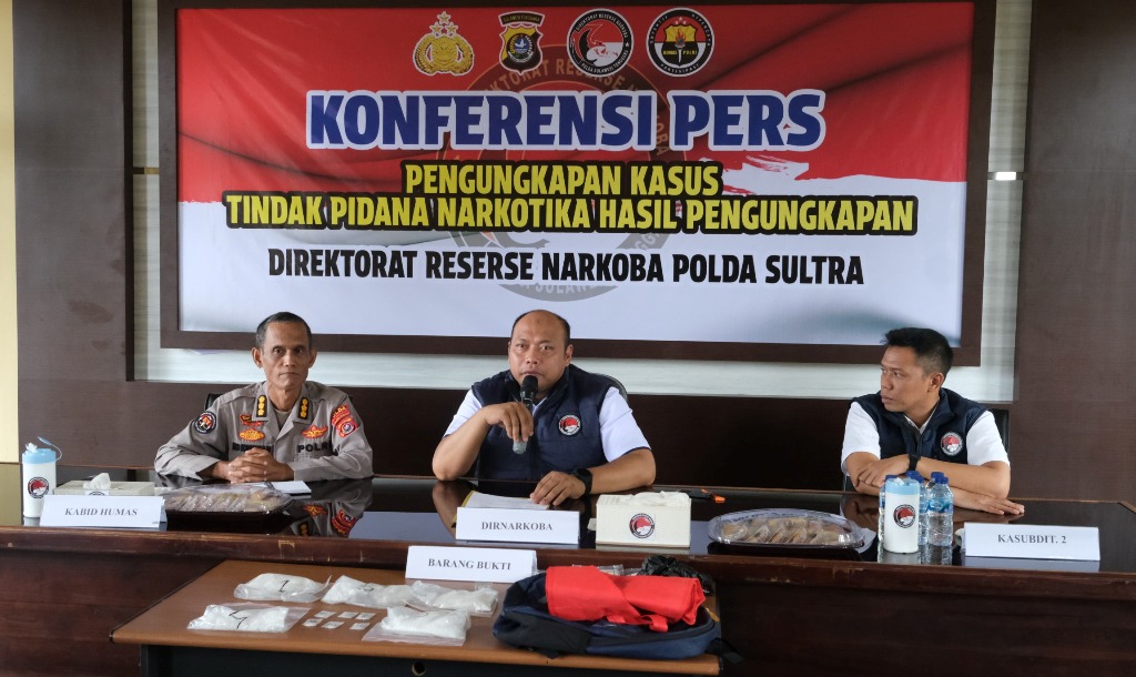 Pengungkapan tersebut dipublikasikan dalam press conference oleh Direktur Reserse Narkoba Polda Sultra, Kombes Pol. Amri Yudhy.S., S.I.K., M.H., didampingi Kabid Humas Polda Sultra Kombes Pol. Iis Kristian, S.I.K., serta Kasubdit 2 Ditresnarkoba Kompol Ario Damar, S.H., S.I.K., M.I.K di Balai Wartawan Polda Sultra, Rabu (29/4/2026).